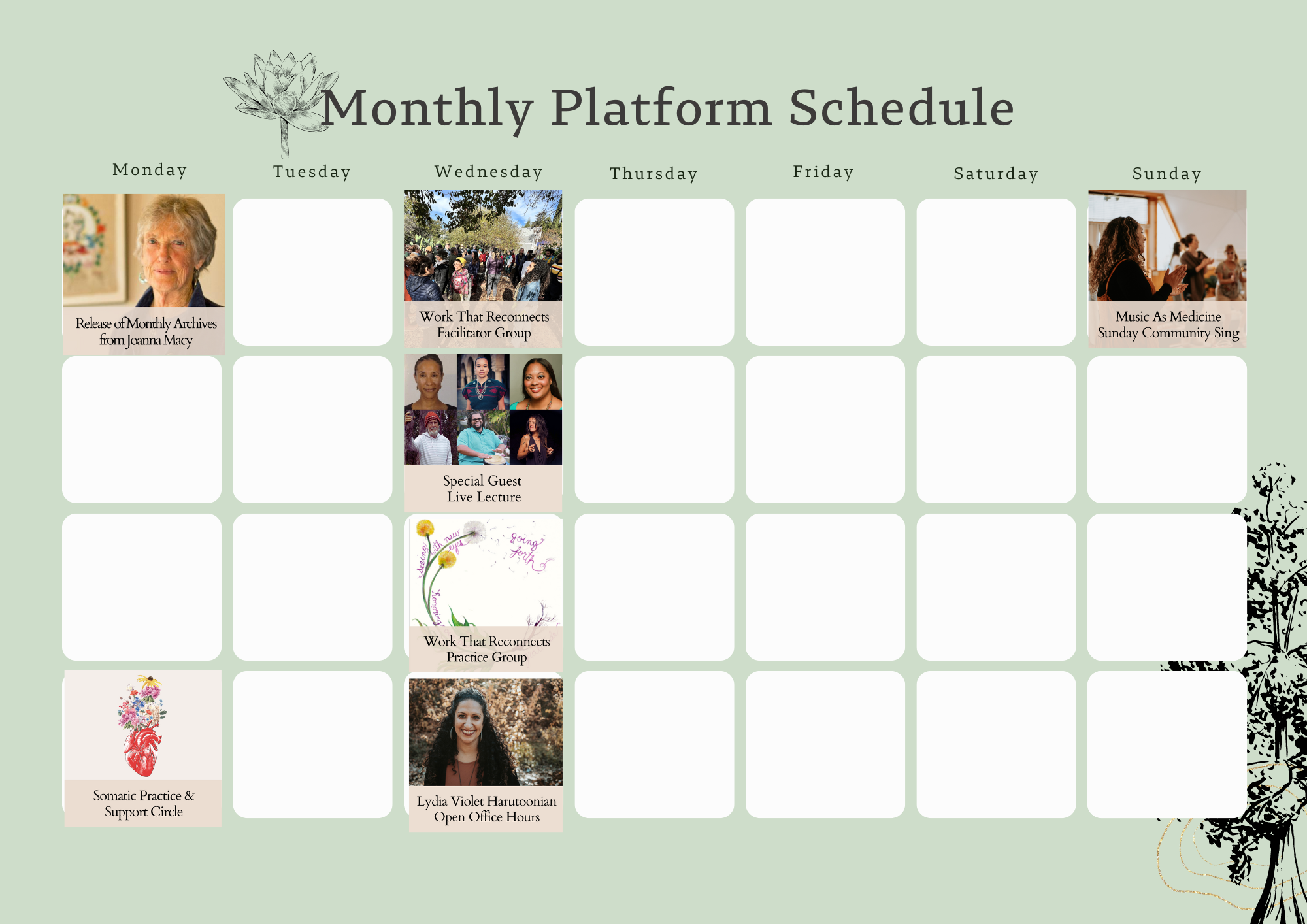 Every month, our founder Lydia Violet also offers open office hours for one-on-one sessions! You can bring questions about the Work that Reconnects, a project you’re working on, or anything that it feels relevant to seek thought partnership from Lydia about.